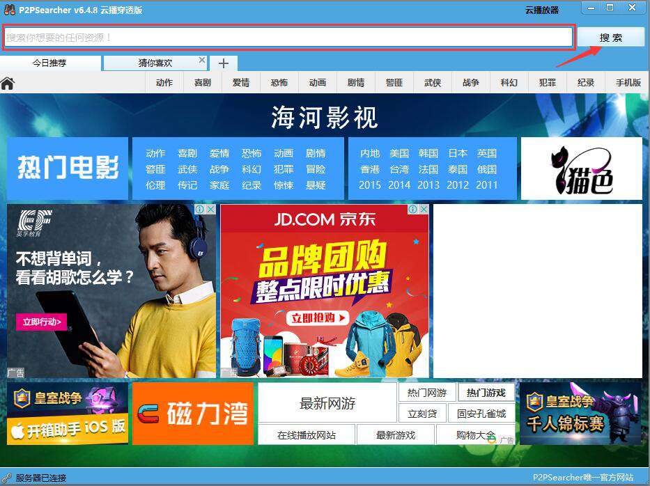 p2p搜索神器怎么搜索?一种是文本框输入关键词进行快速查找。一种是通过分类来查找。按照习惯,在用p2p搜索神器搜索资源时,一般是选择资源数多的下载。另外,资源越多,它的加载速度也会越慢,搜索时,要确保服务器已连接。