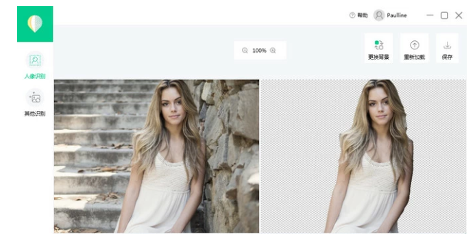 添加图片之后,软件即会自动识别需要保留的人物并去除背景,等待几秒,抠图成功,点击右上角【保存】,就能得到一张透明背景图片。