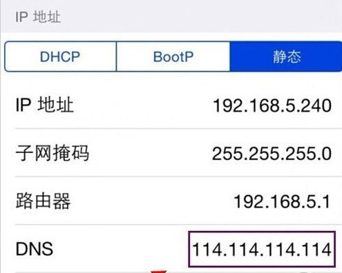 打开苹果手机上的设置,点击“无线局域网”,点击已连接的wifi网络,进入后点击“静态”,输入路由器的IP地址范围、子网掩码、网关,将DNS修改为8.8.8.8或114.114.114.144。