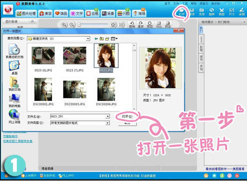 1、打开电脑上安装的“美图秀秀”,然后点击“打开”,选择需要更换背景的图片并导入到软件中,如下图: