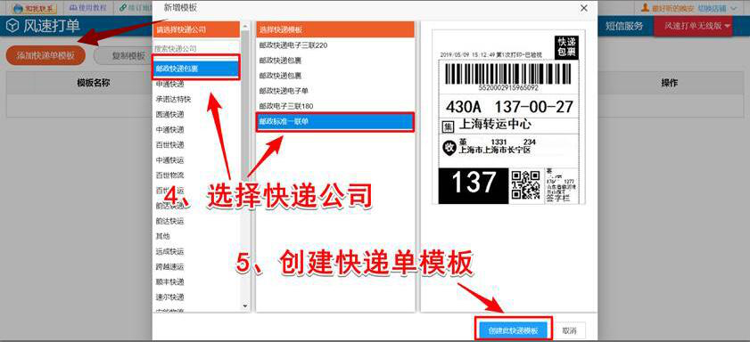 3、选择快递公司,并且点击右下方的“创建快递模板”。