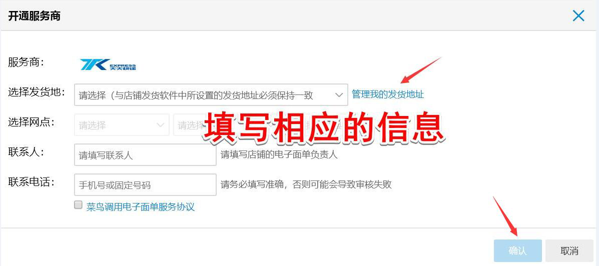 2、正确填写商家的发货地址、联系人、联系电话等相关信息。点击“确定”按钮。