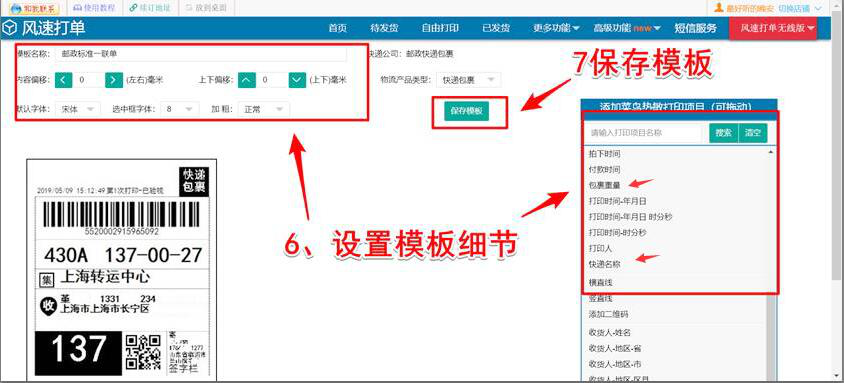 4、对模板的细节进行相关的设置,并点击“保存模板”对模板进行保存,方便下次打印时候直接使用。
