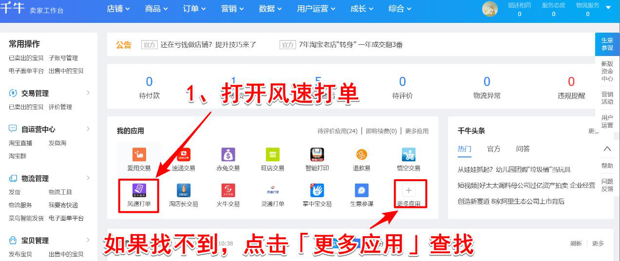 1、在千牛工作台电脑版的“我的应用”中点击“风速打单”的应用。如果找不到该应用,就点击“更多应用”在应用市场里寻找添加。