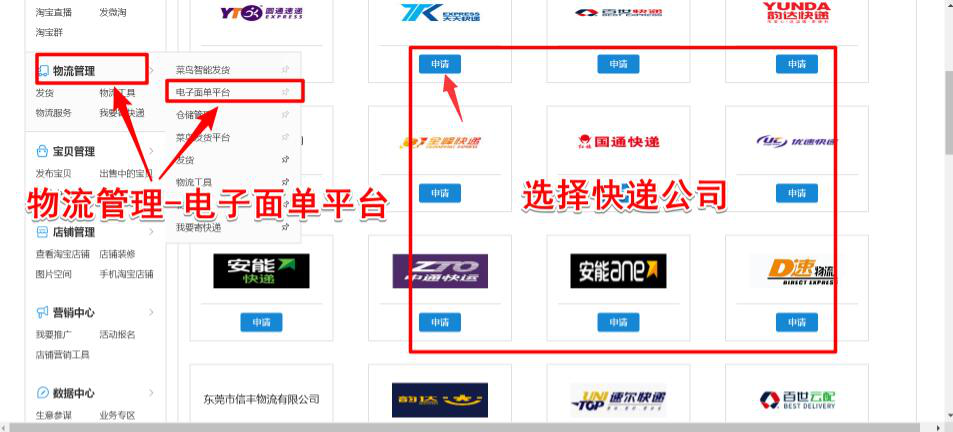 1、打开千牛工作台电脑版,在“物流管理”中,点击“电子面单平台”,并且选择商家需要开通的快递公司,点击“申请”按钮。