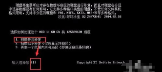 6、在弹出界面左下角输入1进行扫描并修复,如下图: