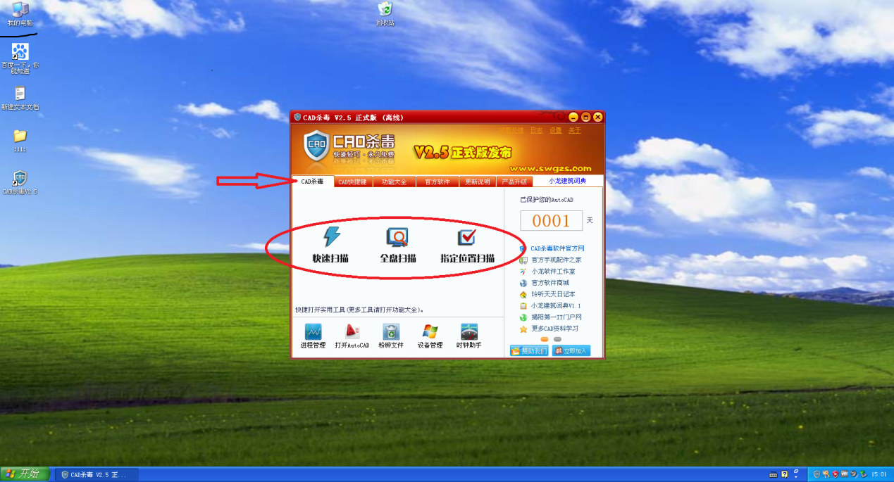 4、选择【CAD杀毒】。和一般杀毒软件很类似,KillCADVirus有三种杀毒方式:【快速扫描】、【全盘扫描】、【从指定位置扫描】,可以根据用户需要选择使用。