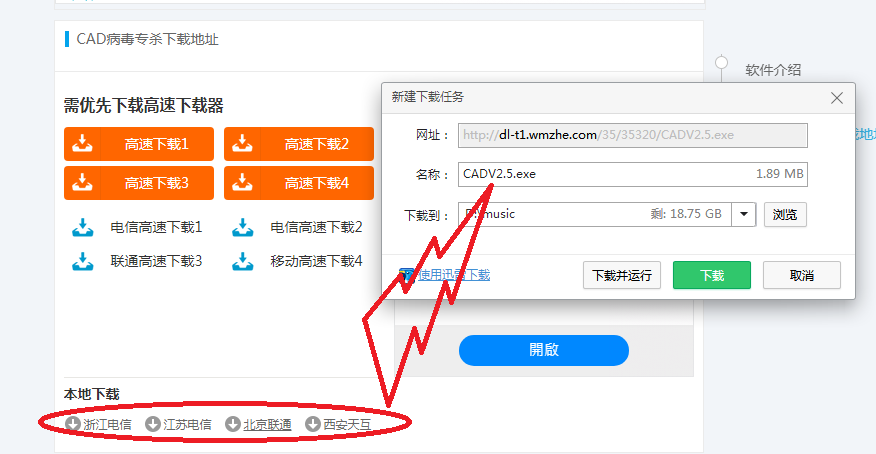 1、首先从网上下载KillCADVirus。注意:下载时要根据自己所用的网络从【本地下载】的选择下载,注意软件名称(如图)。