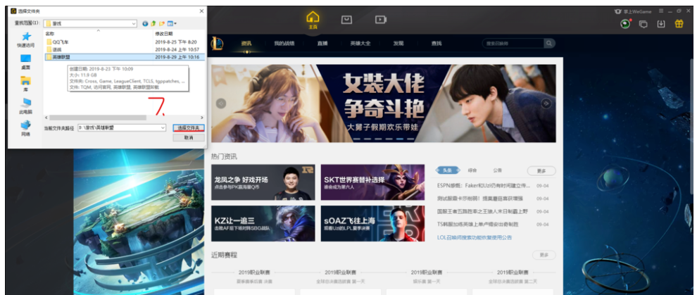 弹出对话框,在英雄联盟的安装目录下找到包含英雄联盟所有文件的那个文件夹,鼠标单击选中,点击右下角的【选择文件夹】,这时你会发现左侧【我的应用】列表中的英雄联盟图标重新出现,再次点击启动,即可恢复正常!