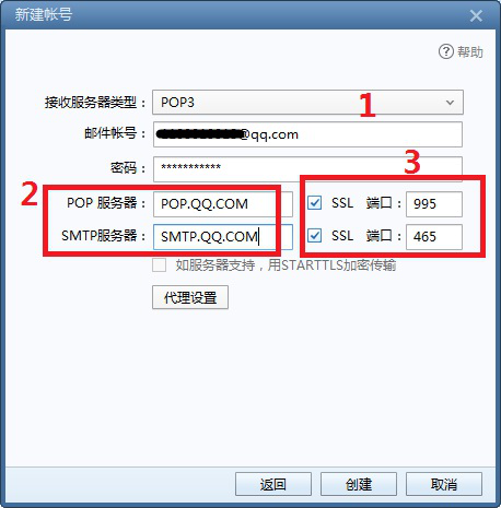 9、然后依次填写POP服务器和SMTP服务器。分别为POP.QQ.com和SMTP.QQ.com,默认端口。最后点击【创建】。(如图)