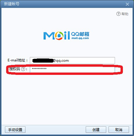 7、按要求填写QQ邮箱账号和授权码(即在QQ邮箱里收到的那个),然后点击左下角【手动设置】。