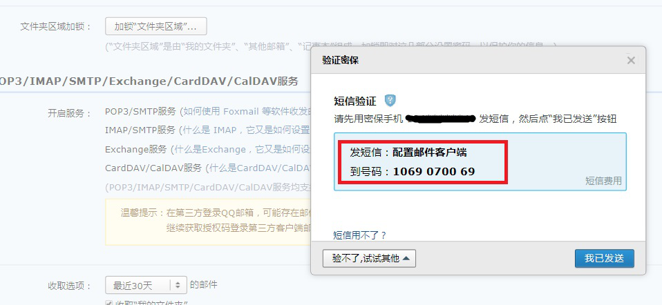 4、按弹窗信息,用密保手机向1069070069 发送短信,内容为“配置邮件客户端”。发送完毕后点击右下【我已发送】,就会收到授权码。记住此授权码!
