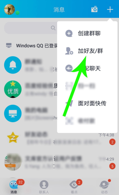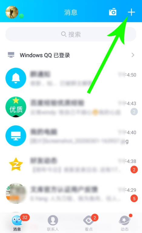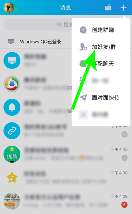 打开手机QQ,登录账号,进入首页,如图,点击右上角的【+】,展开列表,选择【加好友/群】,