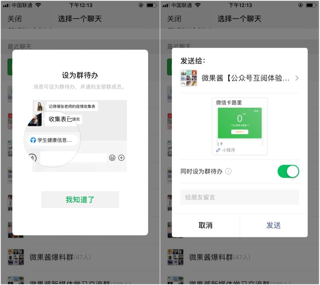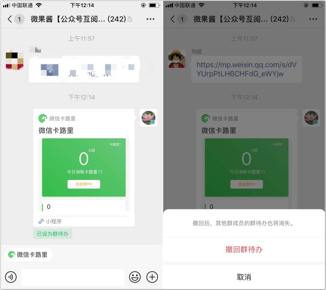 群主和管理员在转发微信小程序时可以选择【设为群待办】,设置完成,该消息将会一直显示在群聊天框的左下角,点击即可进入小程序,当然了,群待办消息可以撤回(目前只有iOS用户才可以收到)。