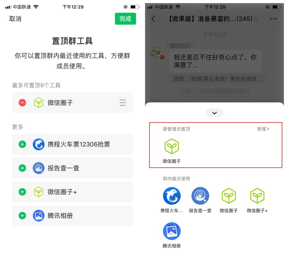 将iOS微信升级至7.0.12版本,打开群聊,你会发现多了一个【群工具】,这里罗列了群友分享以及使用过的小程序,群主和管理员还可以选择置顶一些工具(最多8个)。