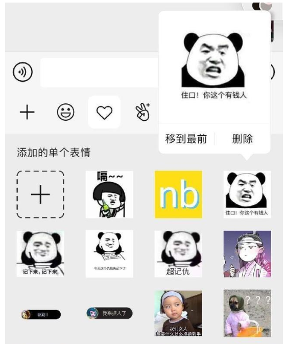进入聊天窗口,长按表情包就会出现【移到最前】和【删除】两个按钮,你可以根据个人喜好对表情包进行排序。