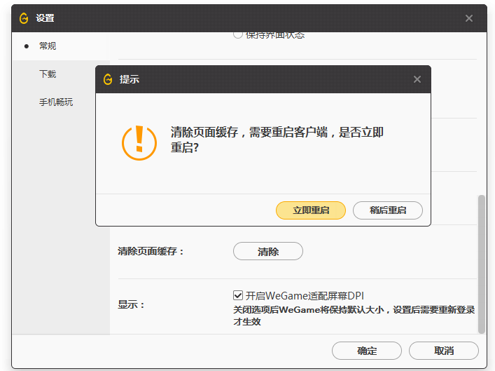 接着切换【常规】选项,点击【清除页面缓存】——【清除】,弹出提示框,清除页面缓存之后需要重启客户端,选择【立即重启】或【稍后重启】,