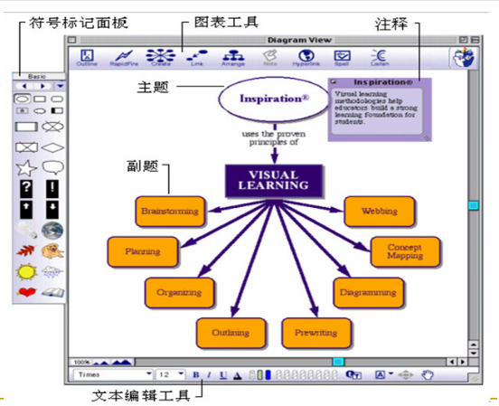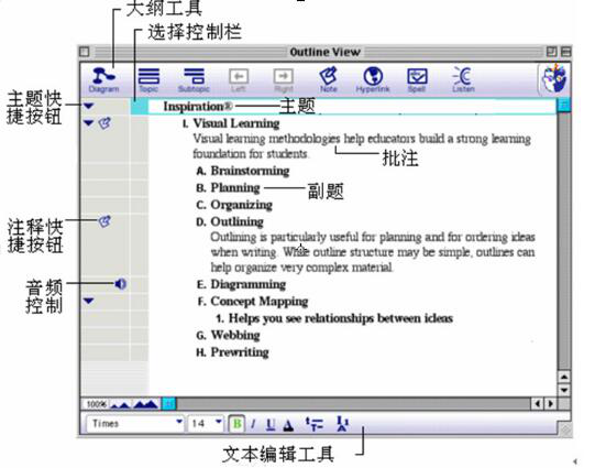 此外,用户使用inspiration软件做思维导图时,最常用到的是如下图的图标工具和大纲工具。
