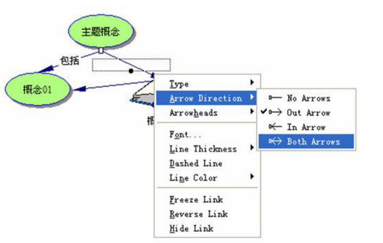 4、当建立好概念之间的关系后,用户还可以在inspiration中修改线条。比如说修改线条的形式。比如,在上一步时,连的线条箭头是单向的,这一步,我们可以将它改成双向的。