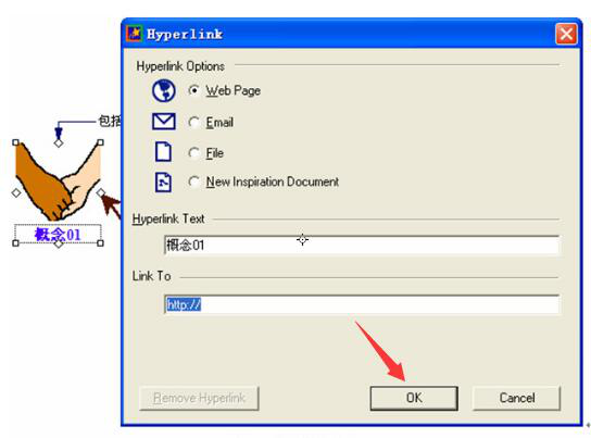3、然后,用户需要将不同的概念进行连接。点击inspiration“图标工具”里的“Link”按钮便可建立概念间的联系。此时,用户可以在连线上输入两者的关系。