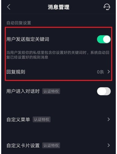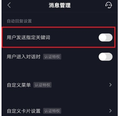 进入消息管理界面,如图,点击开启【用户发送指定关键词】功能,