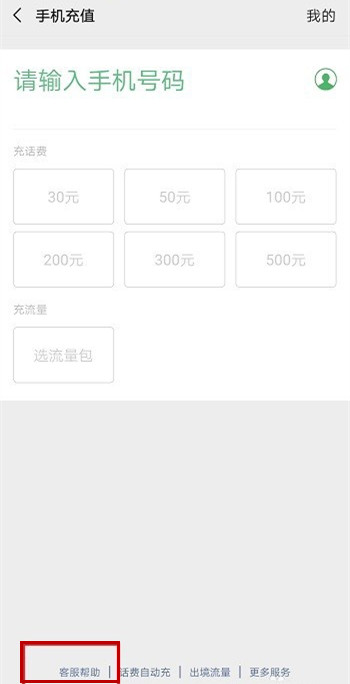 进入手机充值界面,点击下方的【客服帮助】,如图所示,