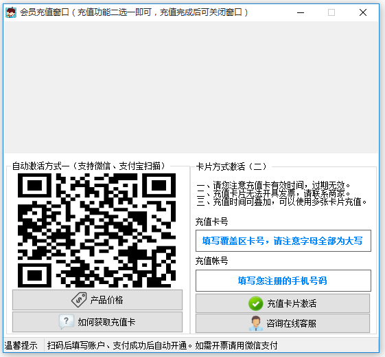 软件支持两种充值方式,一是自动激活(通过微信、支付宝扫描付款),二是卡片激活;如需开票,选择微信支付方式,