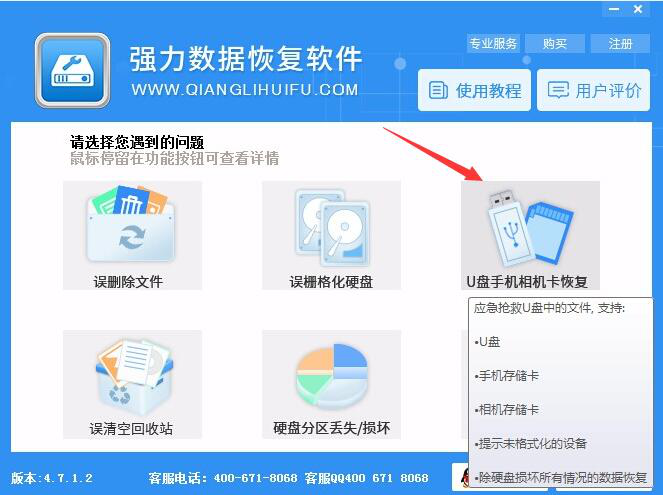 2、然后,打开强力数据恢复大师软件。在其界面中点选“U盘手机相机卡恢复”,从而进入强力数据恢复大师恢复通讯录的下一步操作。