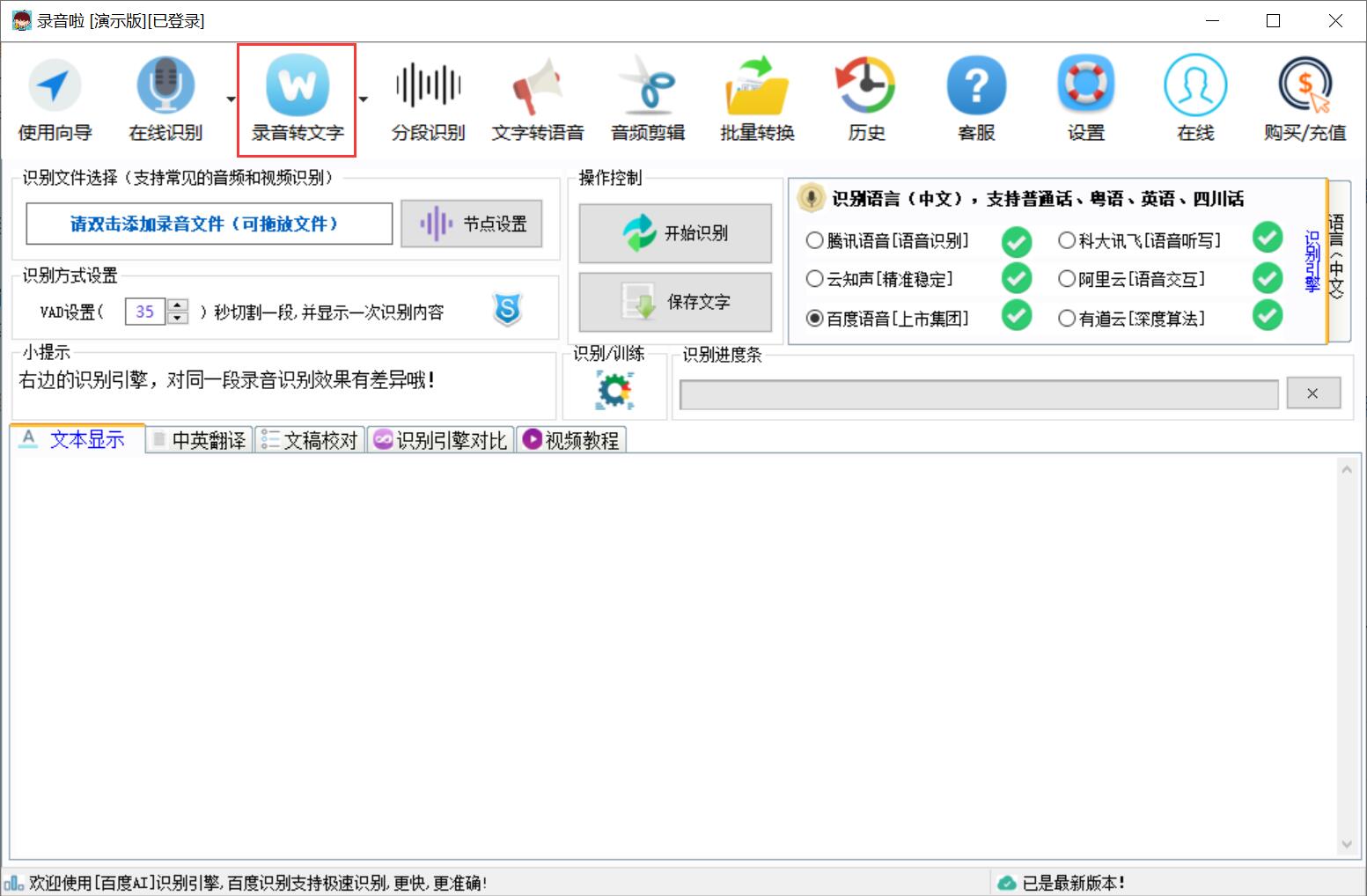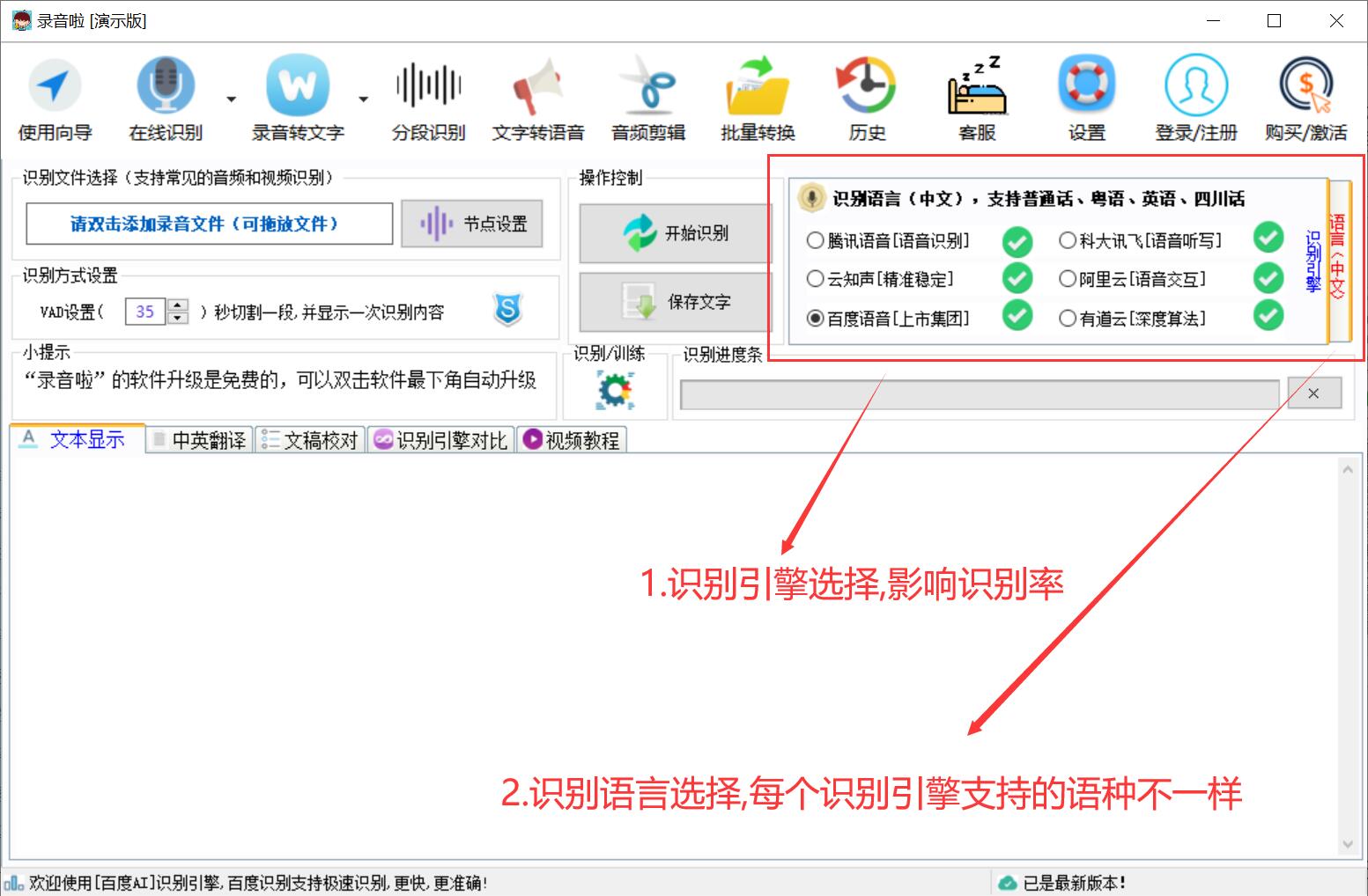 2、这里展示了六种识别引擎,导入录音文件之前,大家可以先来选择识别引擎和文件语言,