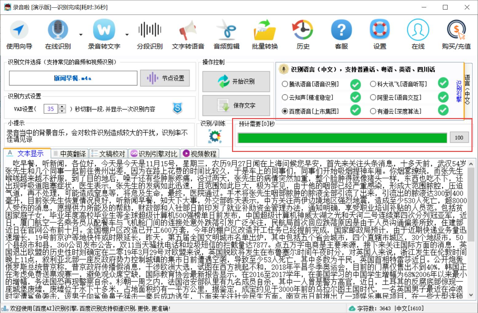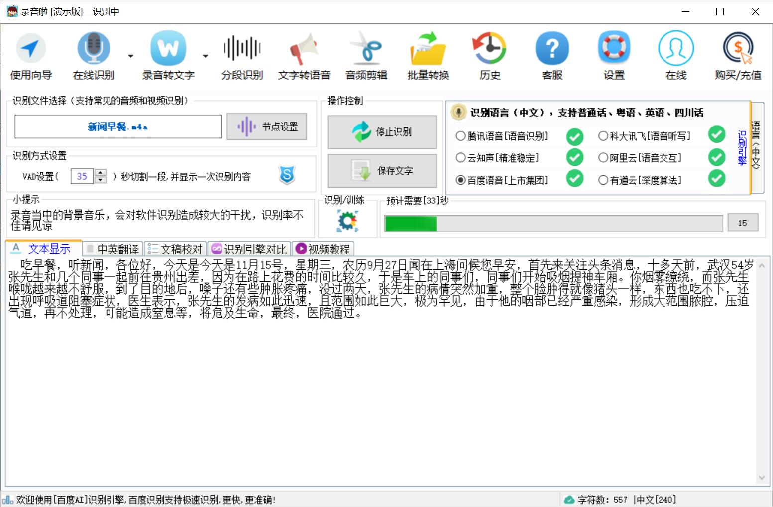4、音频添加成功,点击【开始识别】,软件即可自动转换音频,如图,当前界面会不断显示音频中的文字内容,