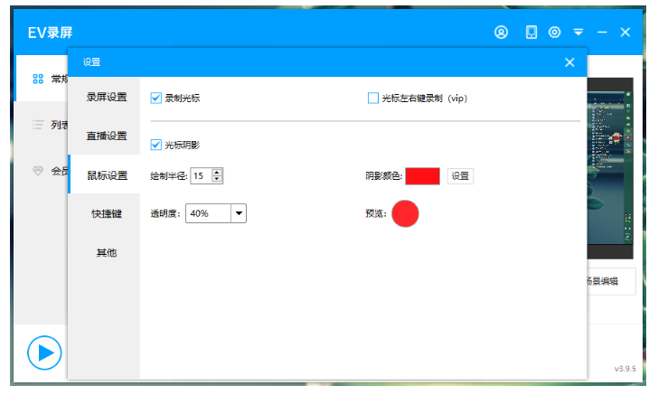 如果你想记录鼠标运动轨迹,点击右上角的设置按钮,进入设置界面,如图,点击【鼠标设置】,勾选【录制光标】、【光标阴影】,还可以设置颜色、大小、透明度。