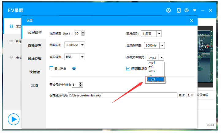 停在设置界面,如图,点击【录屏设置】,选择文件保存格式为mp3;另外,你还可以设置视频帧率、画质级别,