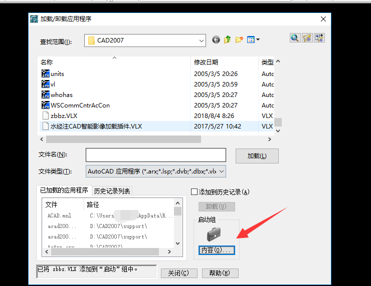 输入appload,加载命令,弹出面板,如图,在下方点击【启动组】——【内容】,