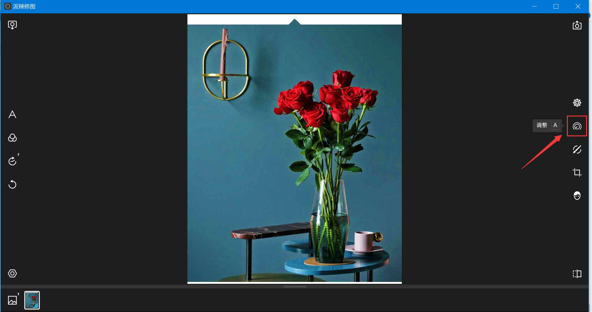 1、先打开泼辣修图,导入需要修的图片,点击泼辣修图右侧的“调整”工具。
