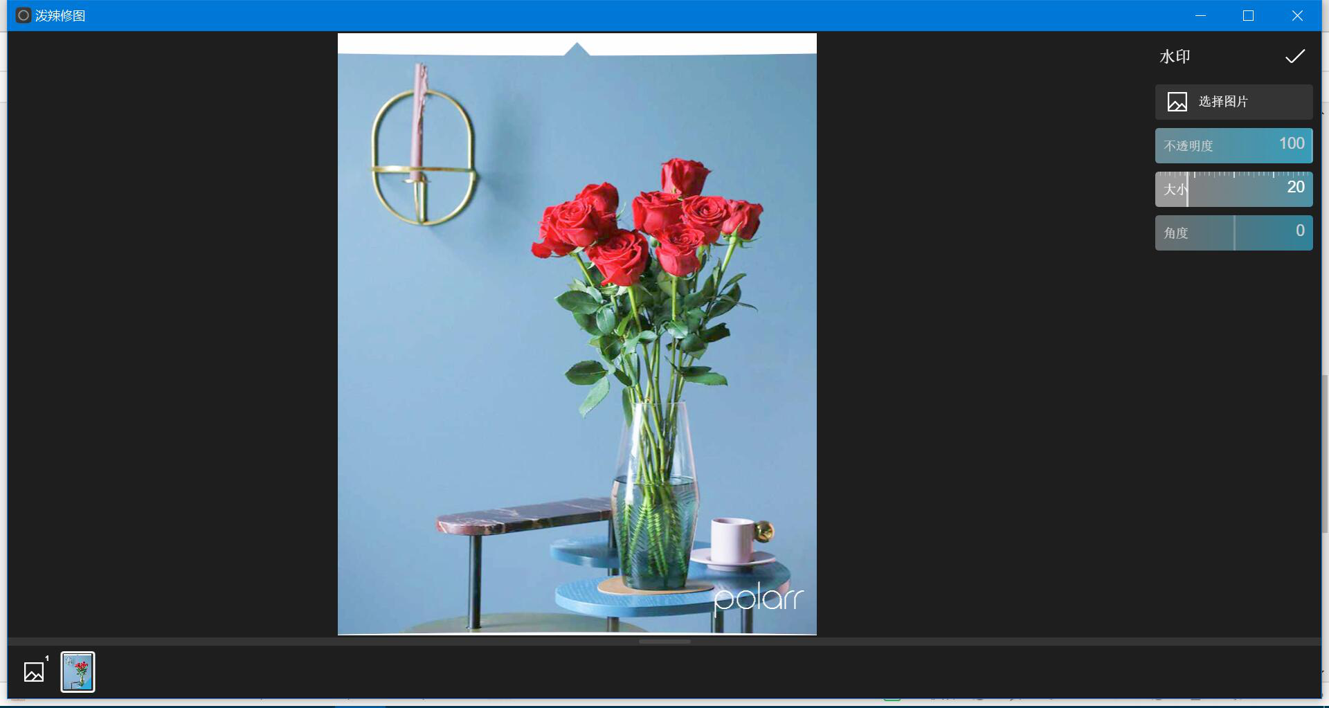 6、之后,泼辣修图资深玩家们就可以自由设置水印的大小、不透明度、角度,也可以选择图片作为自己的水印。