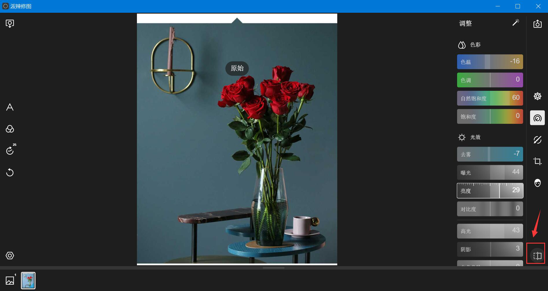 3、此时,相信有些泼辣修图资深玩家就开始问了,泼辣修图怎么查看原图,来对比自己处理后的图片效果?我们可以点击泼辣修图界面右下角的按钮,如下图。长按图片就可以看到原图,松开手就看到编辑处理的效果。