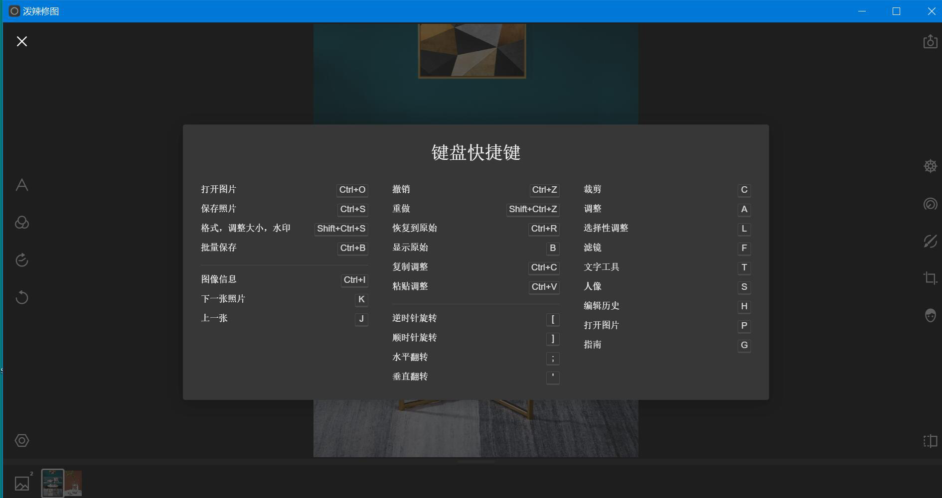 接下来,泼辣修图就会弹出键盘快捷键的展示窗口。用户可以将自己常常要用到的快捷键记下来。
