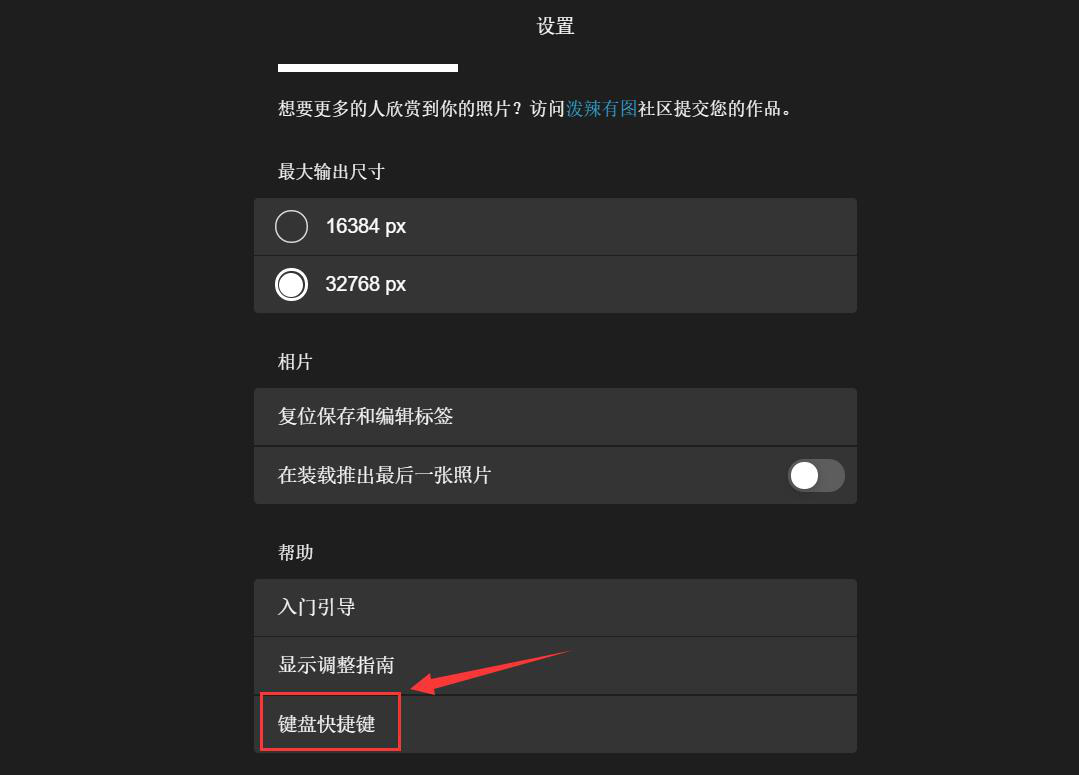 对于经常玩泼辣修图的用户来说,要是能熟悉桌面快捷键,那么修图就会事半功倍,效率大为提高。我们可以在设置里,点选“键盘快捷键”。