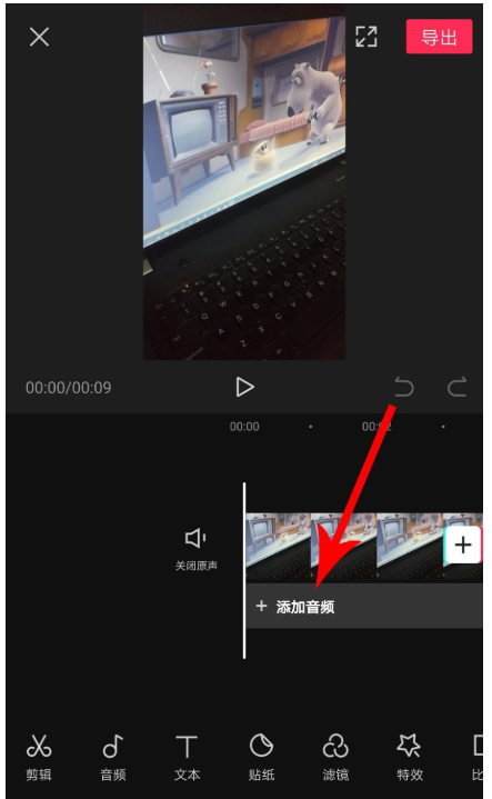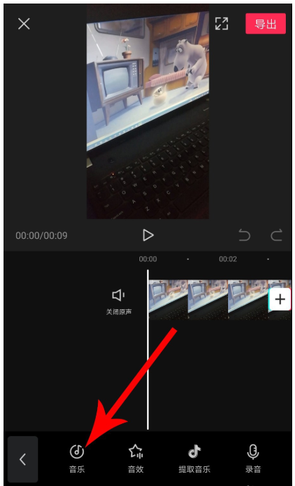 视频导入成功,进入视频剪辑窗口,点击下方的【添加音频】,滑动工具栏,点击【音乐】选项,