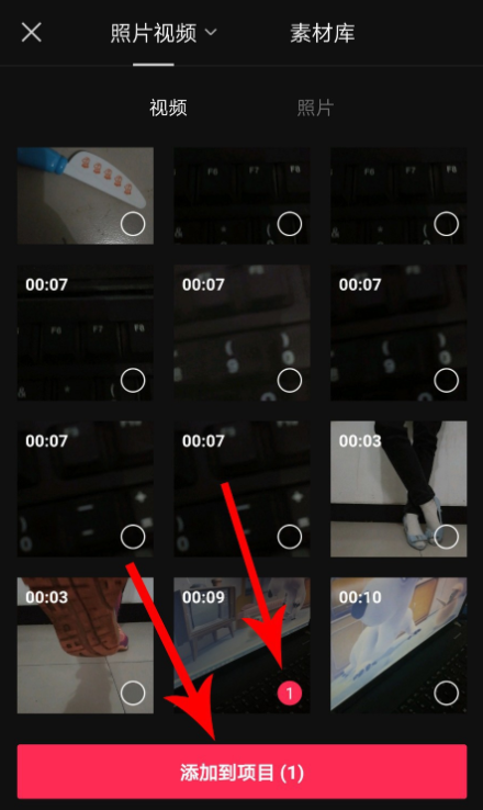 进入手机相册,选择需要处理的视频素材,然后点击【添加到项目】,
