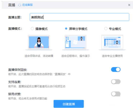进入新窗口,如图,设置一个直播标题,勾选相关选项,点击【创建直播】,