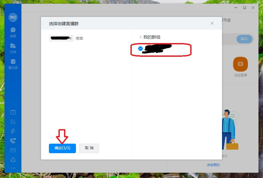 4、弹出“选择创建直播群”窗口,先在右侧“我的群组”点击选择要开群直播的群组,然后点击【确定】,就可以开始群直播了。