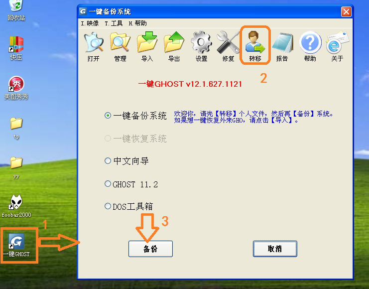 7、点击桌面图标,打开一键ghost软件。选择【一键备份系统】,点击【转移】转移个人文件,然后点击【备份】即可。