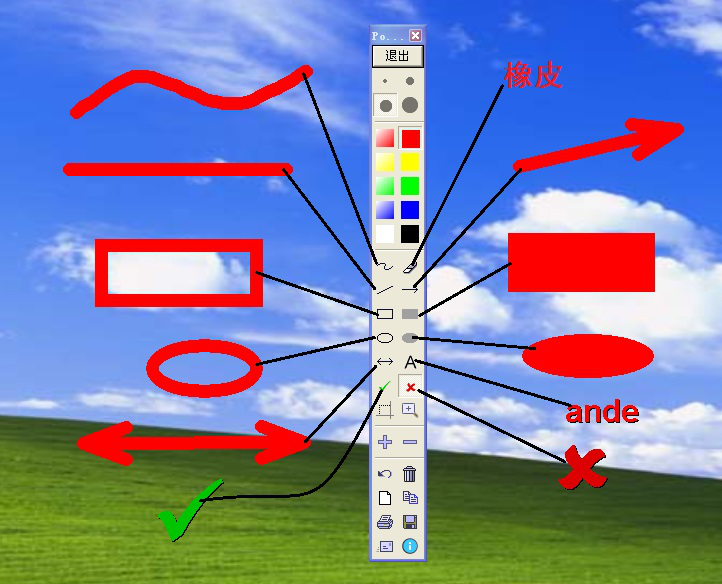 5、接下来看界面中间的菜单。如图所示左侧从上到下依次为曲线、直线、空心矩形、空心椭圆、双箭头、对号,右侧从上到下依次为橡皮、单箭头、实心矩形、实心椭圆、文字、叉号。