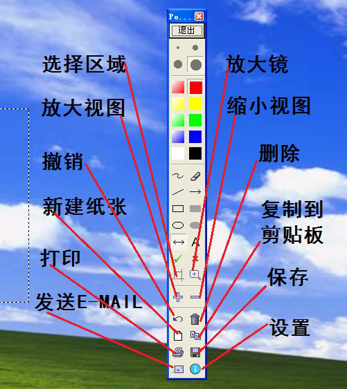 6、最后看界面下方的菜单。如图所示左侧从上到下依次为选择区域、放大视图、撤销、新建纸张、打印和发送Email,右侧从上到下依次放大镜、缩小视图、删除、复制到剪贴板、保存、设置。