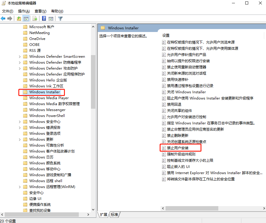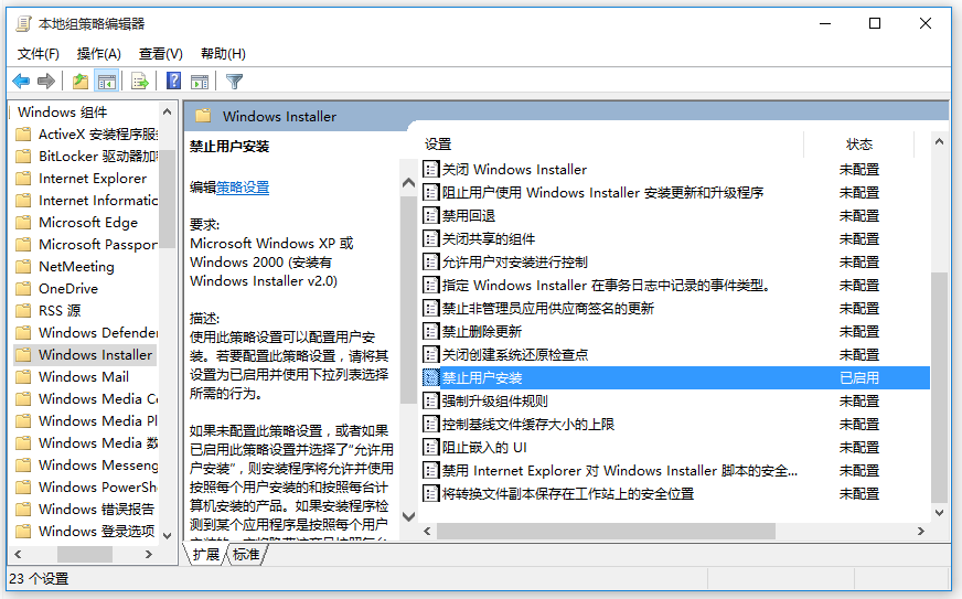 回到本地组策略编辑器窗口,如图,你可以看到【禁止用户安装】选项已启用。