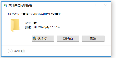 现在开始测试,选中文件夹,将其删除,如图,出现提示,如果点击【继续】,提示你需要具备管理员权限。