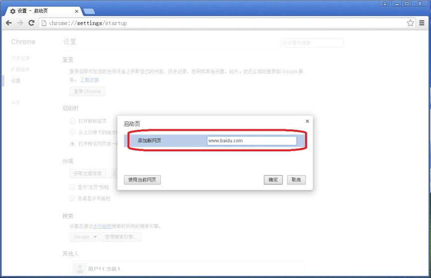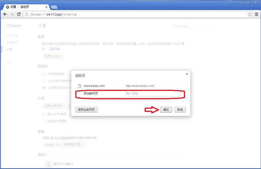 6、输入完毕后,按一下键盘上的按键“Enter”,可以看到特定网页“www.baidu.com”就添加到启动页。同时在它的下方又出现“添加新网页”,可以继续输入别的网址作为新的主页。设置好上述网址后点击【确定】,关闭谷歌浏览器。