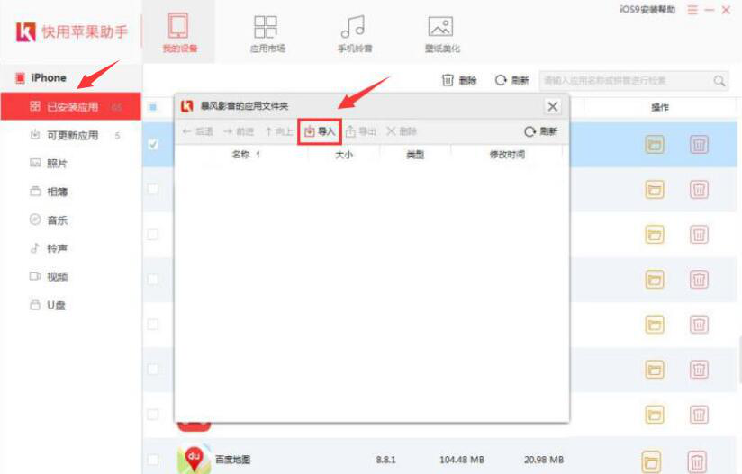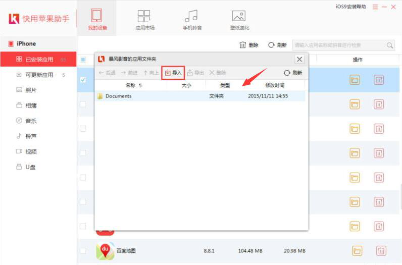 2、然后,在快用苹果助手主界面左侧栏处,点击“已安装应用”,在右侧的应用列表中找到自己常用的视频播放器“暴风影音”。在“暴风影音的应用文件夹”中点击“导入”或者直接将视频文件拖到空白处。