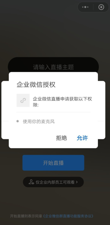 出现提示,企业微信直播需要获取麦克风权限,点击【允许】,